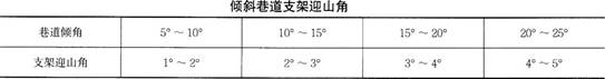倾斜巷道的支架架设,应有适当的迎山角。迎山角的数值,可按下表的规定取值。?