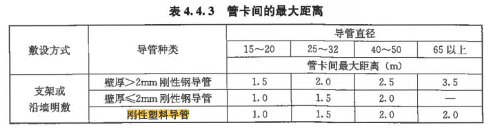 P206-212 明配的电气导管 在距终端、弯头中点或柜、台、箱、盘等边缘150~500mm范围内应设有固定管卡,中间直线段固定管卡间的最大距离应符合表4.4.3规定。