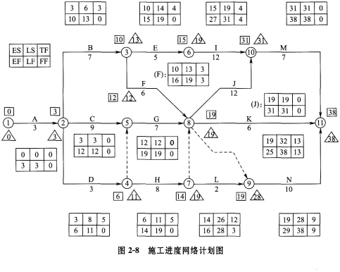 1.施工过程D、G、N三项工作需依次使用施工单位仅有的一台施工机械,在施工总进度计划图中用图示表述这一要求。在调整后的施工进度网络计划图中,标示节点最早时间(□),节点最迟时间(△);标示各工序MS、EF、LS、LF、TF、FF。确定关键线路,确定计划工期。