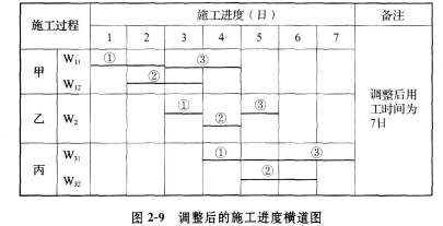 6.发包方在施工过程中提出增加一项附加施工要求(w),承包方按正常施工时间提出了包括三个施工过程的进度横道图,见图2—7。