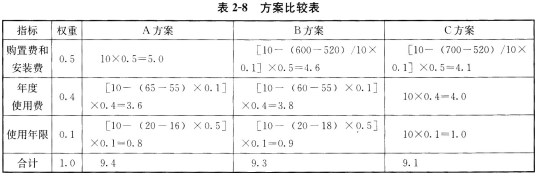 1.拟采用加权评分法选择采购方案,对购置费和安装费、年度使用费、使用年限三个指标进行打分评价,打分规则为:购置费和安装费最低的方案得10分,每增加10万元扣0.1分;年度使用费最低的方案得10分,每增加1万元扣0.1分;使用年限最长的方案得10分,每减少1年扣0.5分;以上三个指标的权重依次为0.5、0.4和0.1。应选择哪种采购方案较合理?