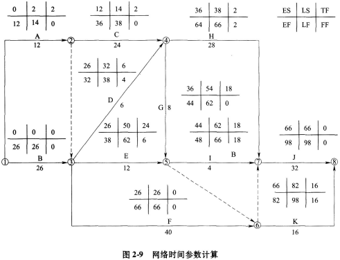 (1)在网络图上计算原始方案各工作的时间参数,确定关键路线和工期,计算综合费用。需认真仔细,避免出错。 (2)网络进度计划调整优化。首先选择关键工作压缩费率最低的压缩;其次检查关键路线是否改变,若改变,应同时压缩各关键路线的时间,达到压缩工期的目的;如此反复,直至达到满足合同工期要求、综合费用最低的网络进度计划(满足合同工期要求后,考虑是否压缩,主要看压缩工期增加的费用与工期提前奖励的费用哪个大,若前者小于后者,还可压缩;若前者大于后者,则应停止压缩)。 [解析] 问题(1): 计算网络进度计划原始方案各工作的时间参数,见图2-9。确定网络进度计划原始方案的关键路线和计算工期。 关键线路:①→③→⑥→⑦→⑧ 工期:98天问题(2): 计算综合费用 原始方案估计费用:18+40+25+15+40+120+16+37+10+64+16=401(万元) 延期罚款:5×(98-93)=25(万元) 综合费用为:401+25=426(万元) 问题(3): 第一次调整优化:在关键线路上取压缩单位时间增加费用最低的F工作为对象压缩2天。增加费用:2×2=4(万元) 第二次调整优化:ACHJ与BFJ同时成为关键工作,选择H工作和F工作作为调整对象,各压缩2天。 增加费用:2×(1.5+2)=7(万元) 第三次调整优化:ACHJ与BFJ仍为关键工作,选择A工作和F工作作为调整对象,各压缩1天。 增加费用:1×(2+2)=4(万元) 优化后的关键线路为: ①→③→⑥→⑦→⑧(或关键工作为A、C、H、J) 和①→②→④→⑦→⑧(或关键工作为B、F、J) 工期:98-2-2-1=93(天) 最低综合费用:401+4+7+4=416(万元)