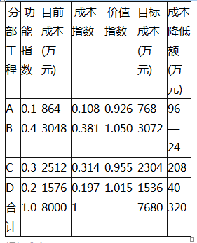 (3)假定A、B、C、D四个分部分项工程的成本目前分别为864万元、3048万元、2512万元和1576万元,目标成本降低总额为320万元,见表2-15,试计算各分部工程的目标成本及其可能降低的额度,并确定各分部工程功能的改进顺序。(成本指数和价值指数的计算结果保留三位小数)