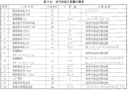 1.计算分部分项工程量。依据《全国统一安装工程预算工程量计算规则》计算工程量,并将工程量及计算过程填人表3-41中未列出的分部分项工程项目的相应栏目中。