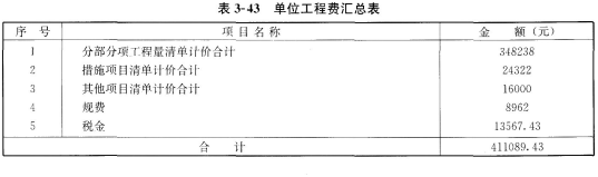 3.依据《建设工程工程量清单计价规范》编制“单位工程费汇总表”。设某工程按工程量清单计价,经计算分部分项工程量清单合价348238元,措施项目清单合价24322元,其他项目清单合计16000元,规费8962元,经测算,增值税、城市维护建设税、教育费附加和地方教育费附加的综合税率为3.413%,试编制单位工程费汇总表,并将有关数据和相关内容填入表3-43“单位工程费汇总表”中。