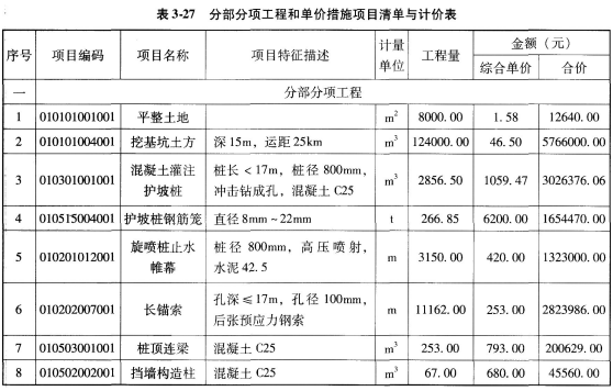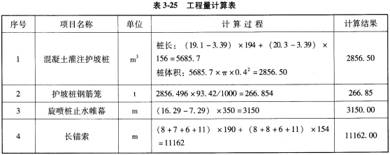 (1)根据工程图纸及技术参数,按《房屋建筑与装饰工程工程量计算规范》(GB 50854--2013)的计算规则,在表3-21中,列式计算混凝土灌注护坡桩、护坡桩钢筋笼、旋喷桩止水帷幕及长锚索四项分部分项工程的工程量。护坡桩钢筋含量为93.42kg/m3。