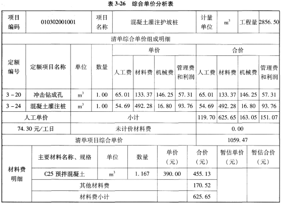 (2)混凝土灌注护坡桩在《房屋建筑与装饰工程工程量计算规范》(GB 50854--2013)中的清单编码为010302001,根据给定数据,列式计算综合单价,填入表3-22中,管理费以及人材机费用合计为基数按9%计算,利润以人材机和管理费用合计为基数按7%计算。