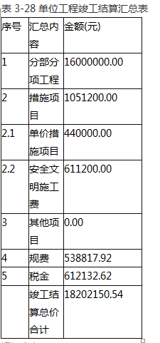 (4)利用以下相关数据,在表3-24中编制某单位工程竣工结算汇总表,已知相关数据如下:①分部分项工程费用为16000000.00元;②单价措施费用为440000.00元,安全文明施工费为分部分项工程费的3.82%;③规费为分部分项工程费、措施项目费及其他项目费合计的3.16%;④税金利率为3.48%。