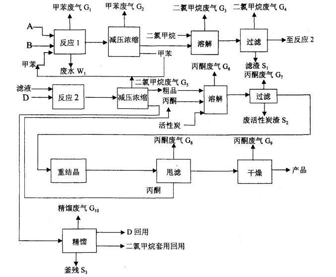 某化工项目工艺过程如下:在反应釜内加入一定量的甲苯溶剂及原料A,搅拌并缓慢加热使原料完全溶解,然后加入反应物B。充分搅拌后加热回流1.5h,分出反应水分,反应完毕后,物料转入浓缩釜,减压蒸去甲苯,回收后套用。浓缩物用二氯甲烷溶解,过滤除杂,滤液转入密闭反应釜,加入过量(理论量的1.5倍)的液态反应物D。控制温度在10~20℃反应1h,减压蒸去二氯甲烷及过量反应物,得到粗品,用丙酮进行重结晶,活性炭脱色。结晶后离心甩滤,滤料在干燥箱内干燥后得到产品E。丙酮母液循环套用。蒸出的二氯甲烷及过量反应物D的混合物精馏回收。