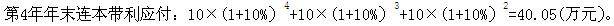 某人第1年年初向银行借款10万元,第1年年末又借款10万元,第3年年初再次借款10万元,年利率均为10%,到第4年年末连本代利一次还清,应付的本利和为( )万元。