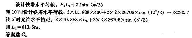 某220kV线路双分裂导线直线转角塔,设计使用条件为l H=400m,lv =600m,允许转角φ=3°~10°。大风工况下风压为10.888N/m,张力为26706N,该导线允许最大张力35015N,若铁塔为大风工况控制,当直线塔带5°转角时,允许水平档距为()。