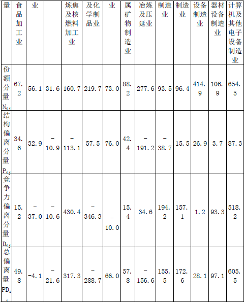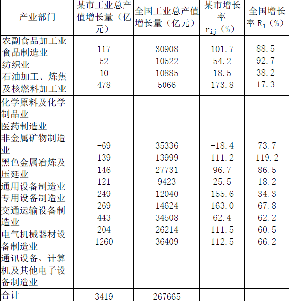 偏离-份额分析法可以用来评价区域经济结构和竞争力,找出区域具有相对竞争优势的产业部门,确定区域未来 产业结构调整的方向。该研究机构采用偏离-份额分析法可以对某市主要制造业的竞争力情况进行分析。 使用偏离-份额分析法分析的主要过程为: (1)根据表3-4 提供的数据计算2010-2015 年某市和全国部分产业部门工业总产值的增长量和增长率。 表3-5 2010-2015 年某市和全国部分产业部门工业总产值的增长量和增长率同时,根据表3-5 可计算出2010-2015 年期间,全国这些行业的平均增长率R 为58.4%。 (2)据偏离-份额分析法,计算份额分量、结构偏离分量、竞争力偏离分量和总偏离量。 表3-6 2010-2015 年某市部分行业份额分量、结构偏离分量、竞争力偏离分量和总偏离量