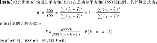 模型中,根据拟合优度R2与F统计量的关系可知,当R2=0时,有( )。