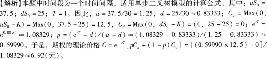 标的资产为不支付红利的股票,当前的价格为30元,已知1年后该股票价格或为37.5元,或为25元。假设无风险利率为8%,连续复利,计算对应1年期,执行价格为25元的看涨期权理论价格为( )元。