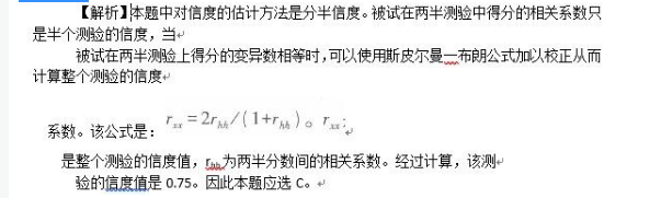 使用某个测验对某个群体进行施测,之后将测验题目按照奇数题目和偶数题目分成了两部分,经过计算得知所有被试在两半测验上得分的变异数相等,被试在两半测验上得分的相关系数为0.60,那么该测验的信度值是