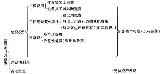 工程建设项目投资(或称建设项目总投资)是指为完成工程项目建设并达到使用要求或生产条件,在建设期内预计或实际投入的全部费用总和。工程建设项目投资中,建设投资和建设期利息两部分对应于固定资产投资,流动资金则对应于流动资产投资。如图所示。