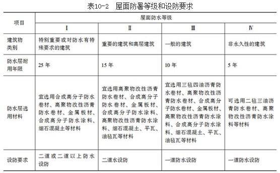 屋面防水等级和设防要求如表10-2所示。
