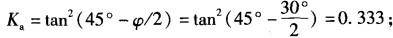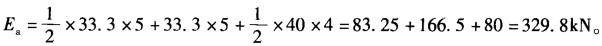 根据《建筑基坑支护技术规程》(JGJ 120—1999)规定坑底往下的主动土压力为矩形分布(见图7-5)。坑顶主动压力强度e0=yhKa=0 坑底主动土压力强度 e1=yhKa =20×5×0.33 =33. 3kPa; 水、土分算主动土压力,水压力为:pw=yz = 10×4=40kPa; 支挡结构受的水平荷载标准值;
