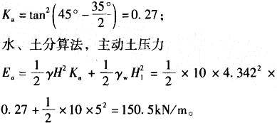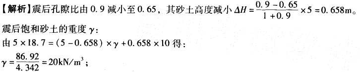 有一码头的挡土墙,墙高5m,墙背垂直、光滑;墙后为冲填的松砂。填土表面水平,地下水位与墙顶齐平。已知砂的孔隙比e=0.9,饱和重度ysat =18.7kN/m3,内摩擦角ψ=30°。强震使饱和松砂完全液化,震后松砂沉积变密实,孔隙比变为e=0.65,内摩擦角变ψ=35。。震后墙后水位不变。试问墙后每延长米上的主动土压力和水压力之总和最接近于下列哪个选项的数值?( )