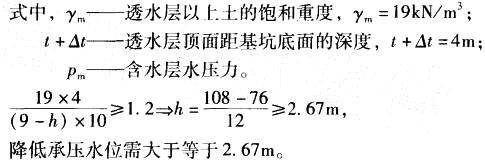根据《建筑地基基础设计规范》(GB 50007-2002)附录W第W. 0. 1条,当上部为不透水层,坑底某深度处有承压水时,坑底抗渗流稳定性![]()