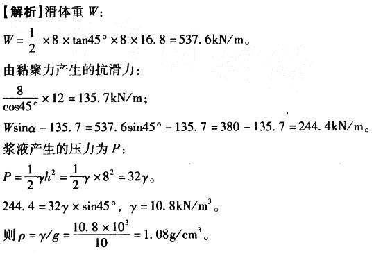 在饱和软黏土地基中开槽建造地下连续墙,槽深8.0m,槽中采用泥浆护壁,如图7-11所示。已知软黏土的饱和重度为16. 8kN/m3, cu = 12kPa,φu = 0。对于图示的滑裂面,问保证槽壁稳定的最小泥浆密度最接近于下列哪个选项?( )