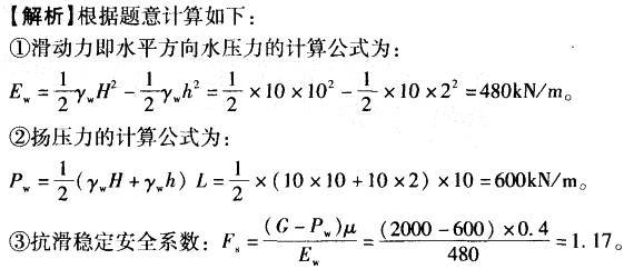 有一个水闸宽度10m,闸室基础至上部结构的每延米不考虑浮力的总自重为2000kN/m,**水位H= 10m,下游水位h=2m,如图7-12所本。地基土为均匀砂质粉土,闸底与地基土摩擦系数为0.4,不计上下游土的水平土压力。验算其抗滑稳定安全系数最接近( )。