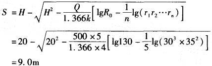 根据《建筑基坑支护技术规程》(JGJ 120—1999)第8. 3. 7条,当为潜水完整井稳定流时,基坑中心点水位降深为:式中,S为在基坑中心处或各井点中心处地下水位降深;r1,r2,…,rn为各井距基坑中心或各井中心处的距离。