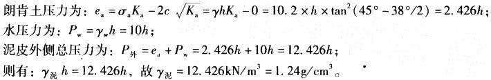 在密实砂土地基中进行地下连续墙的开槽施工,地下水位与地面齐平,砂土的饱和重度ysat=20.2kN/m3,内摩擦角φ=38°,黏聚力c=0,采用水下泥浆护壁施工。槽内的泥浆与地面齐平,形成一层不透水的泥皮。为了使泥浆压力能平衡地基砂土的主动土压力,使槽壁得持稳定,泥浆比重至少应达到( )g/cm3。