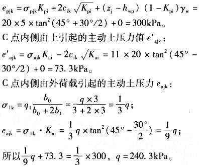 根据《建筑基坑支护技术规程》(JGJ120—1999)第 3.4节、第 3.5 节,C 点埋深11m,小于b0+3b1=3+3×3= 12m,在支护结构外侧荷载影响范围之内,具体分析如下:C点外侧被动土压力epjk :