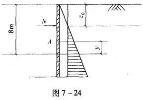 某开挖深度为8m的基坑,采用600mm厚的钢筋混凝土地下连续墙,墙体深度为18m,支撑为一道Φ5500×11的钢管支撑,支撑平面间距为3m,支撑轴线位于地面以下2m。地下水位在地面以下1m,地层为黏性土,天然重度y=18kN/m3,内摩擦角φ=10°, c=10kPa。不考虑地面荷载。若用朗肯土压力理论(水土合算)和静力平衡法进行计算,则: