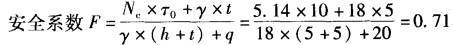 根据《建筑地基基础设计规范》(GB 50007—2002)附录V,进行基坑底抗隆起稳定性验算:式中,Nc为承载力系数,条形基础时取Nc=5.14;τ0 为抗剪强度(kPa); y为土的重(kN/m3);t为支护结构人员土深度(m);h为基坑开挖深度(m);q为地面荷载(kPa)