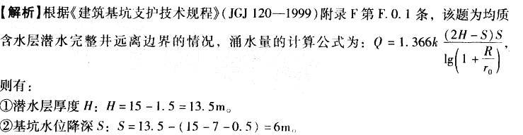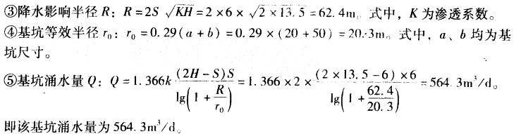 某矩形基坑位于均质粉砂土场地中,场地中粉砂土厚15m,渗透系数为2m/d,其下伏地层为泥岩,基坑尺寸为20m×50m,深7.0m,降水井深度为15m,地下水位为1.5m,基坑施工时要求水位降至基坑底面以下0.5m。基坑采用完整井群降水,附近无地表水体(基坑远离边界),按《建筑基坑支护技术规程》(JGJ120—1999)计算,基坑涌水量为( )m3/d。