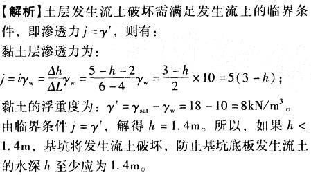 图7-26为某地基土层剖面图。根据测压管中水位可知,承压水头高出砂层顶面5m, 砂展为承压水层。现在黏土层中开挖4m深的基坑,要求确定防止基坑底板发生流土的水深h至少应为( )m。