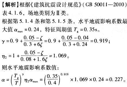 已知某建筑场地抗震设防烈度为8度,设计基本地震加速度为0.30g,设计地震分组为第一组。场地覆盖层厚度为20m,等效剪切波速为240m/s,结构自振周期为0.4s,阻尼比为0.04,在计算水平地震作用时,相应于多遇地震的水平地震影响系数值最接近于下列哪个选项?( )