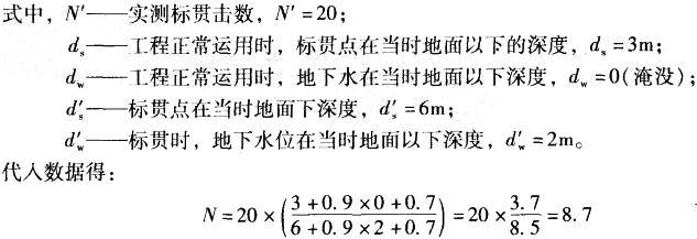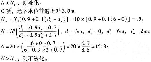 根据《水利水电工程地质勘察规范》(GB 50487—2008)附录P第P.0.4条,填方和水位下降均值砂土液化可能性减小,可排除AD两项。B项,场地普遍挖方3.0m,标准贯入锤击数临界值:![]()