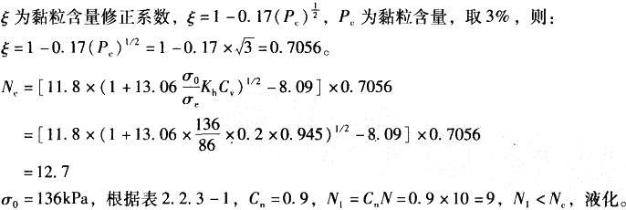 根据《公路工程抗震设计规范》(JTJ 004—1989)第2. 2. 3条,当N1<Nc时为 液化。 N1=CnN Nc=[11.8×(1+13.06σ0/σeKhCv)1/2-8.09]ξ 标准贯入点处土的总覆压力: σ0=yudw+yd(ds-dw)=18×2 +20×(7-2)=136kPa 标贯点处土的有效覆盖压力: σc=yudw+(yd-10)(ds-dw)=18×2+(20-10)×(7-2)=86 式中,yu——水位以上土重度; yd——水位以下土重度; dw——水位埋深; ds——标贯点深度。