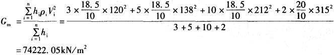 根据《公路工程抗震设计规范》(JTJ 004—1989)附录六,当覆盖土层厚度超过20m时,取自地表起20m范围内土层的平均剪切模量,则场地土平均剪切模量为:式中,n表示覆盖土层的分层数,hi、ρi、Vi分别为土的厚度、质量密度和剪切波速度。