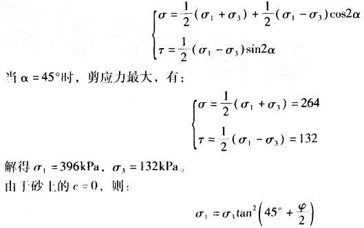 已知一砂土层中某点应力达到极限平衡时,过该点的最大剪应力平面上的法向应力和剪应力分别为264kPa和132kPa,问关于该点处的大主应力σ1、小主应力σ3以及该砂土内摩擦角φ的值,下列哪个选项是正确的?( )