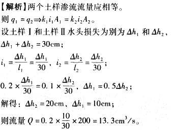 某常水头渗透试验装置如图1-1所示,土样I的渗透系数k1=0.2cm/s,土样II的渗透系数k2= 0.1 cm/s, 土样横截面积A= 200cm2。如果保持图中水位恒定,则该试验的流量q应保持为下列哪个选项?( )