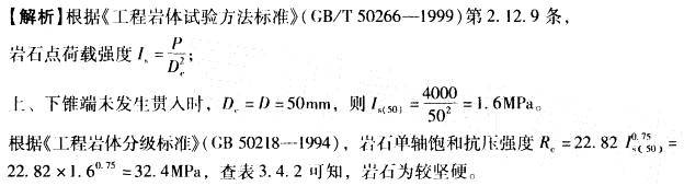 取直径为50mm、长度为70mm的标准岩石试件,进行径向点荷载强度试验,测得破坏时的极限荷载为4000N,破坏瞬间加荷点未发生贯入现象。试分析判断该岩石的坚硬程度属于下列哪个选项?( )