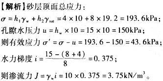 某场地地下水位如图1-2所示,已知黏土层饱和重度γsat= 19. 2kN/m3,砂层中承压水头hw=15m(由砂层顶面起算),hw=4m,h2 =8m。问砂层顶面处的有效应力及黏土中的单位渗流力最接近下列哪个选项?( )