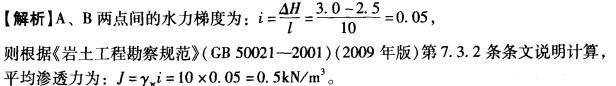 某岸边工程场地细砂含水层的流线上 A、B两点,A点水位标高2.5m,B点水位标高3.0m,两点间流线长度为10m,请计算两点间的平均渗透力将最接近( )kN/m3。