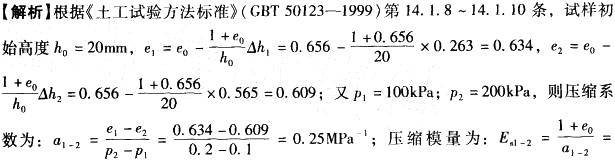 某土样固结试验成果如表1-11所示。试样天然孔隙比e0=0. 656,该试样在压力100 ~ 200kPa的压缩系数及压缩模量为( )。