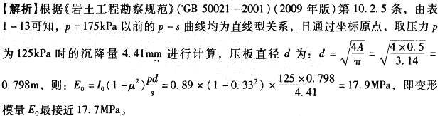 某建筑场地在稍密砂层中进行浅层平板载荷试验方形压板底面积为0.5m2,压力与累积沉降量关系如表1 -13所示。变形模量E0最接近于下列( )MPa。(土的泊松比μ= 0. 33,形状系数为0.89)
