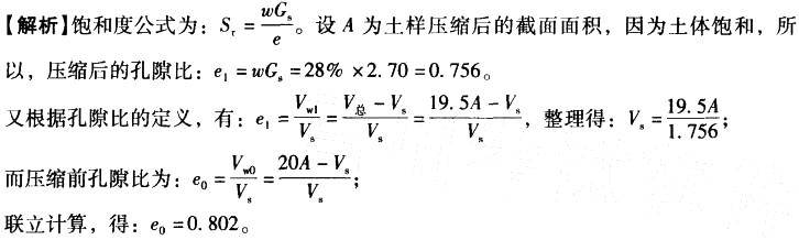 饱和土样(Sr= 1)的比重Gs= 2.70,高度为20mm,压缩后的含水率w=28%,高度为19.5mm。则压缩前的孔隙比e0为( )。