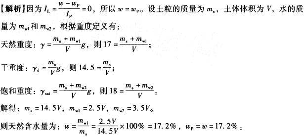 某土样的天然重度y= 17kN/m3,干重度yd=14.5kN/m3,饱和重度ysat=18kN/m3,液性指数IL=0, 土的塑限wP为( )。