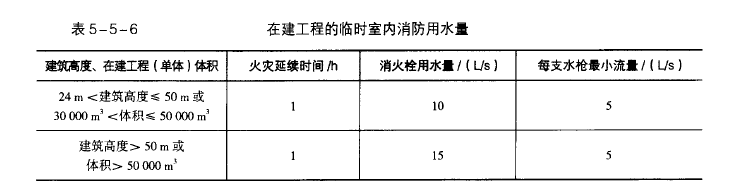 教材P505 在建工程的临时室外消防用水量不应小于下表的规定。表5-5-6在建工程的临时室内消防用水量,体积小于等于5万立方米的时候,消火栓用水量为10L/s要注意室内和室外的区别。