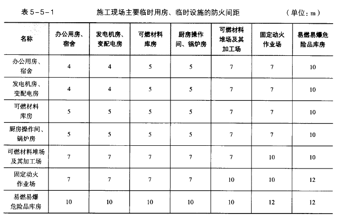 教材P498 施工现场主要临时用房、临时设施的防火间距不应小于表5-5-1的规定。
