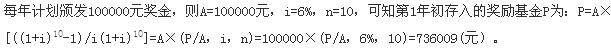 某公司准备建立一项为期10年的奖励基金,用于奖励有突出贡献的员工,每年计划颁发100000元奖金,从第1年开始至第10年正好用完账户中的所有款项,若利率为6%,则第1年初存入的奖励基金应为多少元?( )