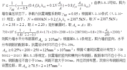 根据《高层建筑混凝土结构技术规程》(JGJ 3—2010)第7.2.10条第2款规定,地震设计状况时,偏心受压剪力墙的斜截面受剪承载力满足:
